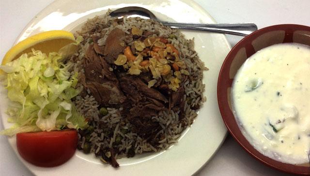 Served with rice & minced meat lamb topped with thin slices of roast leg of lamb, herbs, Nuts & chefs spices.